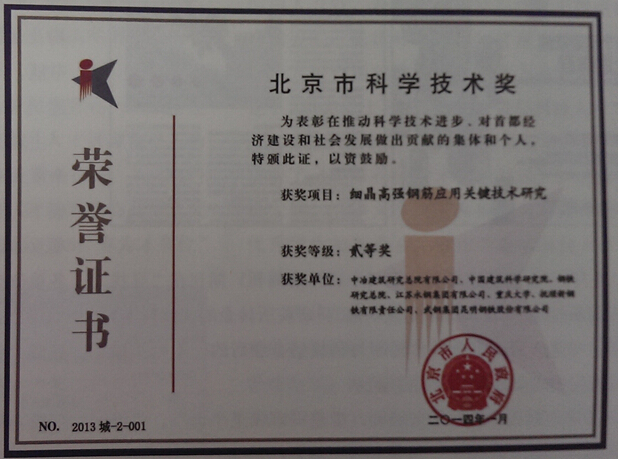 近日,北京市科學技術獎勵工作辦公室發布了2013年北京市科學技術獎二等獎獲獎項目的公告,由鋼材檢測中心牽頭的“細晶高強鋼筋應用關鍵技術研究”項目榮獲2013年北京市科技進步二等獎。