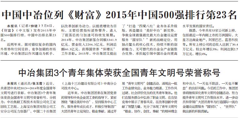 7月8日,《財富》(中文版)發布2015年中國500強排行榜,中國中冶排名第23名。
